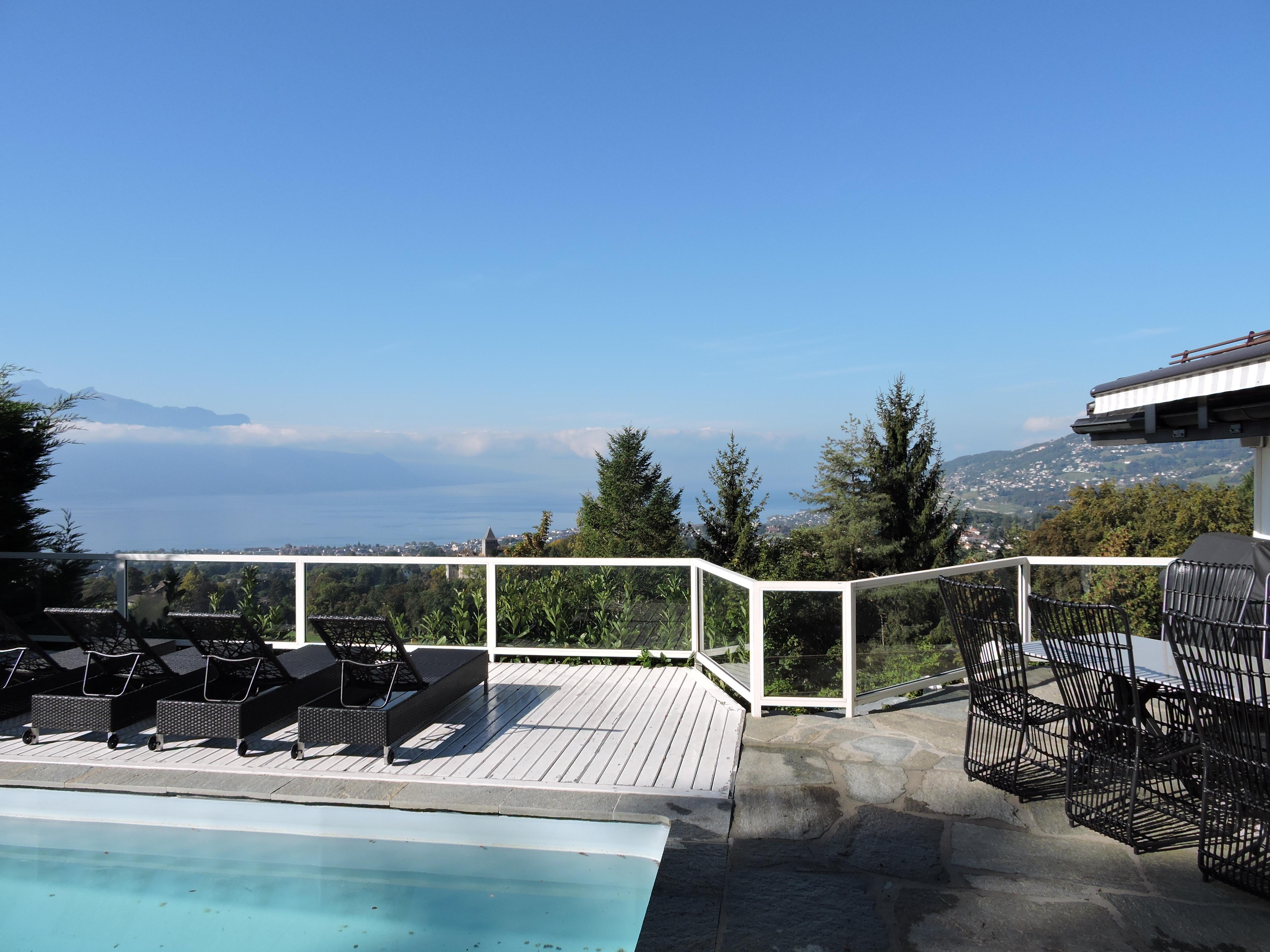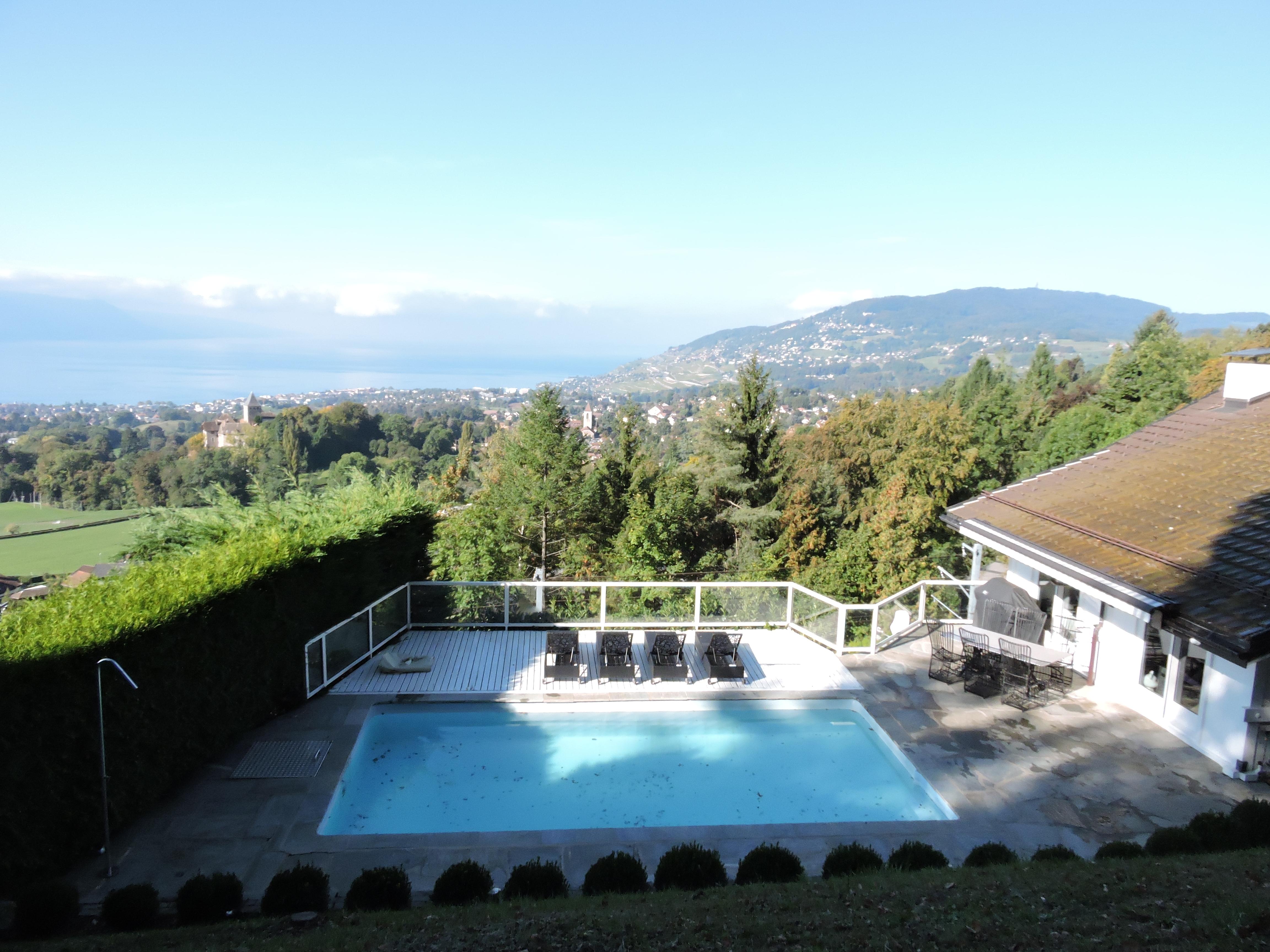 Magnifique villa contemporaine avec piscine extérieure, située sur un terrain bien aménagé et offrant une vue imprenable sur le lac Léman, les montagnes avoisinantes et le château de Blonay.Elle jouit d'une situation dominante dans un quartier résidentiel et calme dans les hauts de la commune.